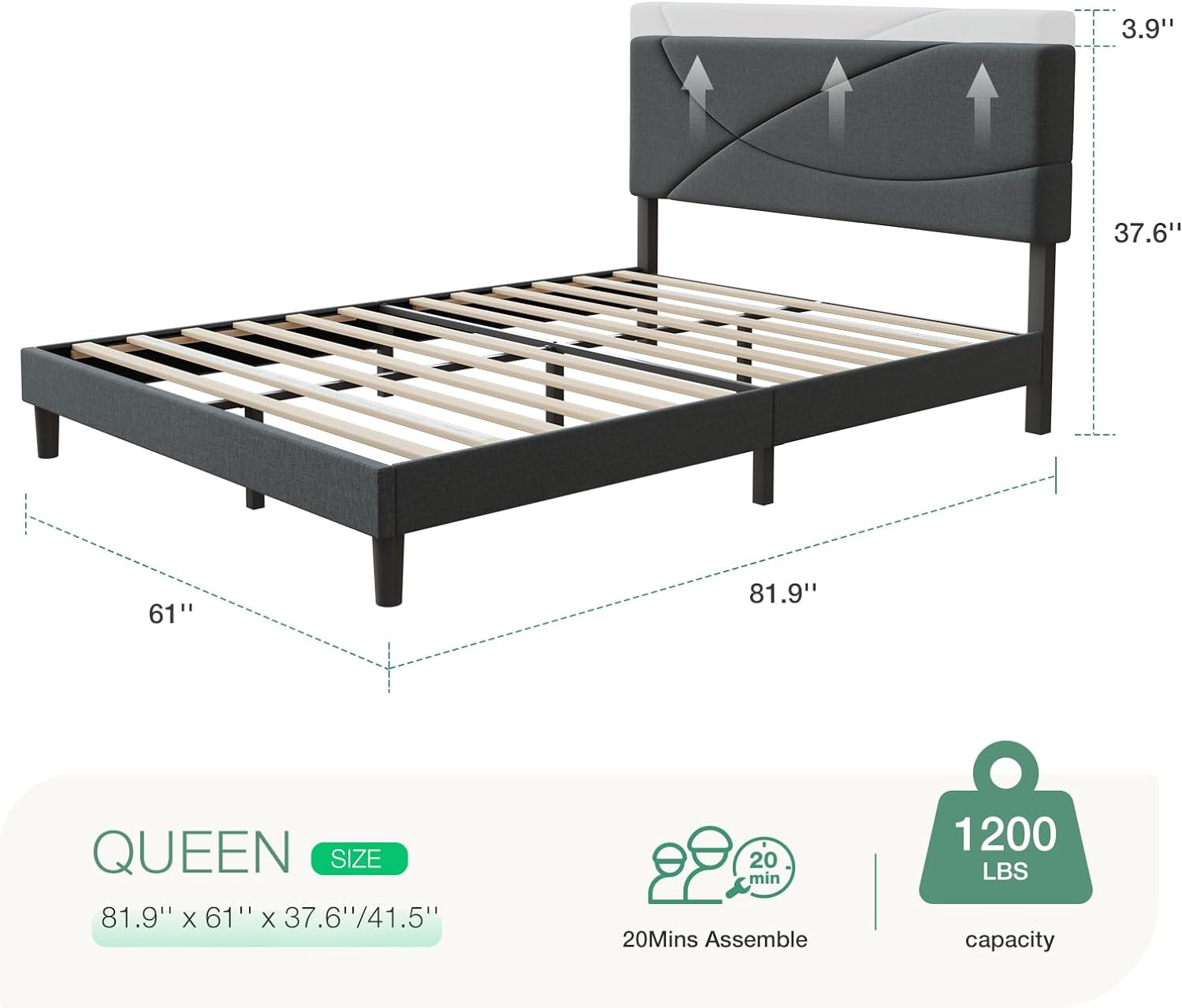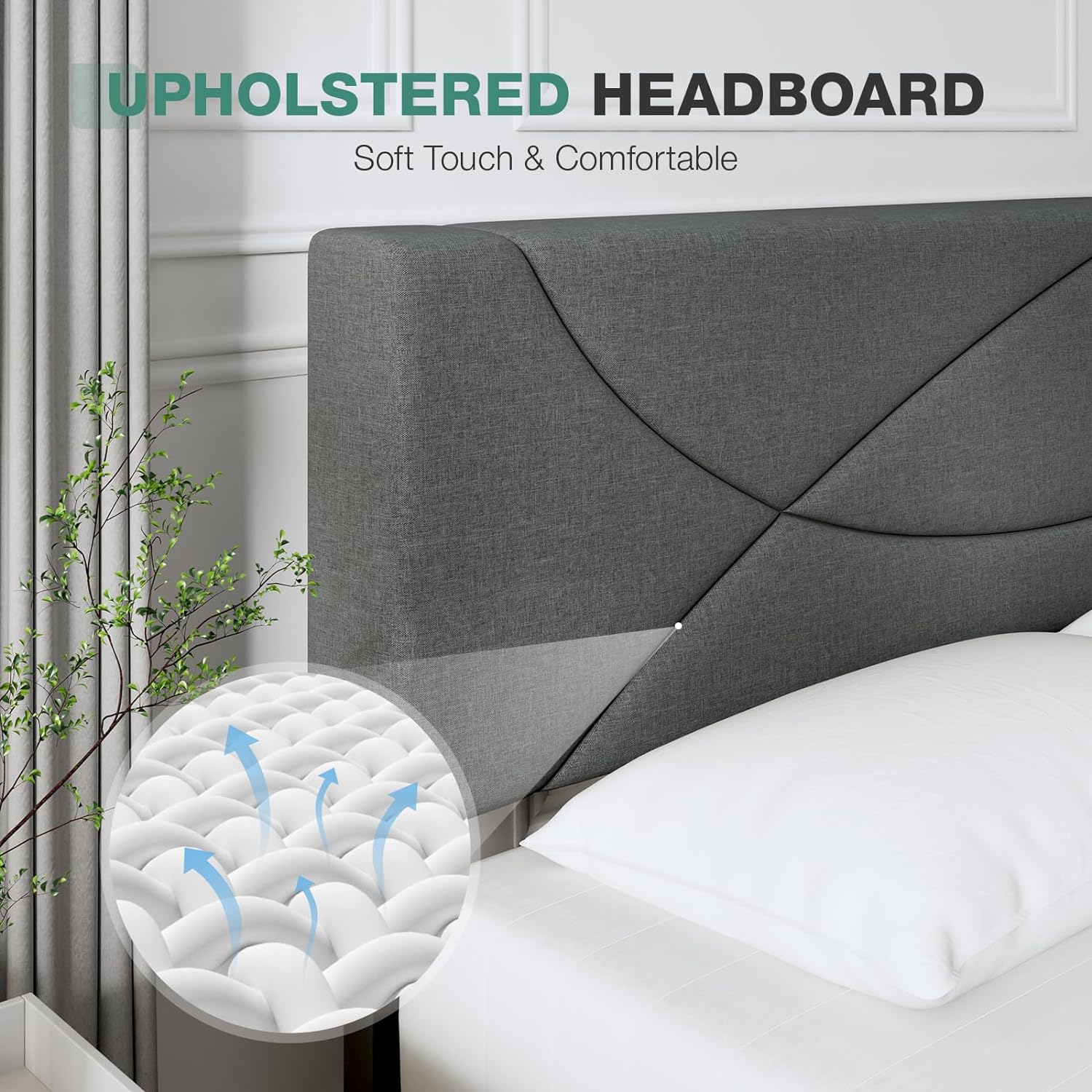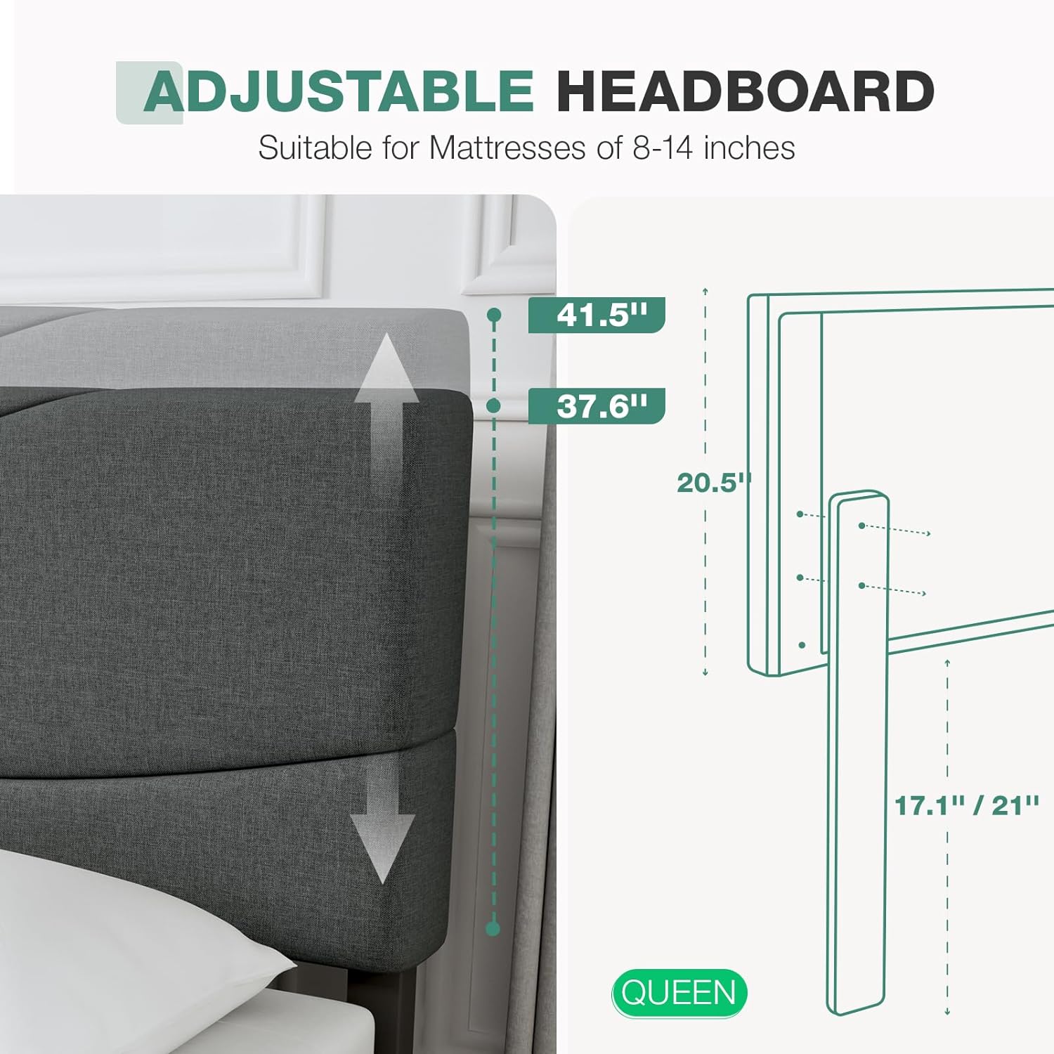 Novilla Queen Size Bed Frame Upholstered Platform Bed with Adjustable Headboard, Queen Bed Frame Upholstered Platform with Strong Wooden Slats, Easy Assembly, Dark Grey